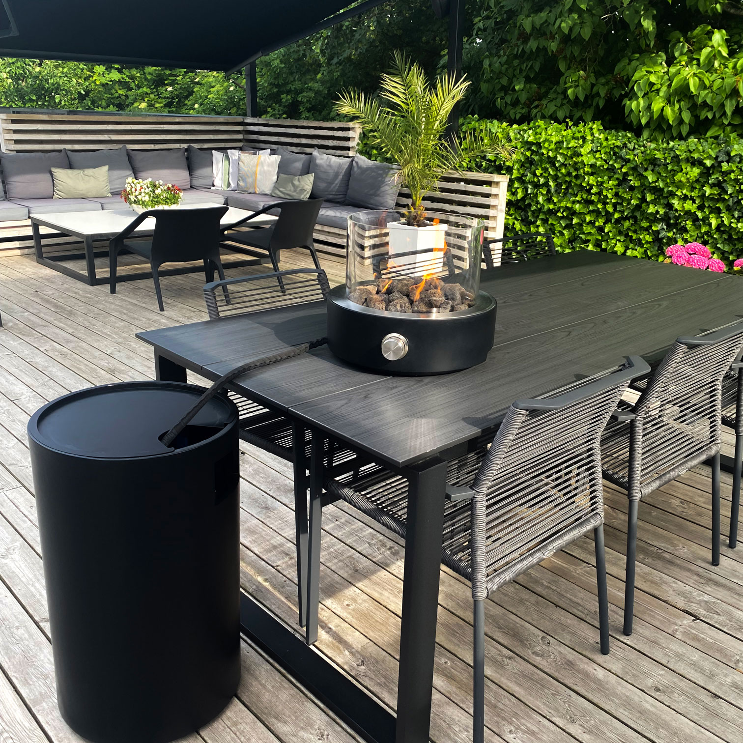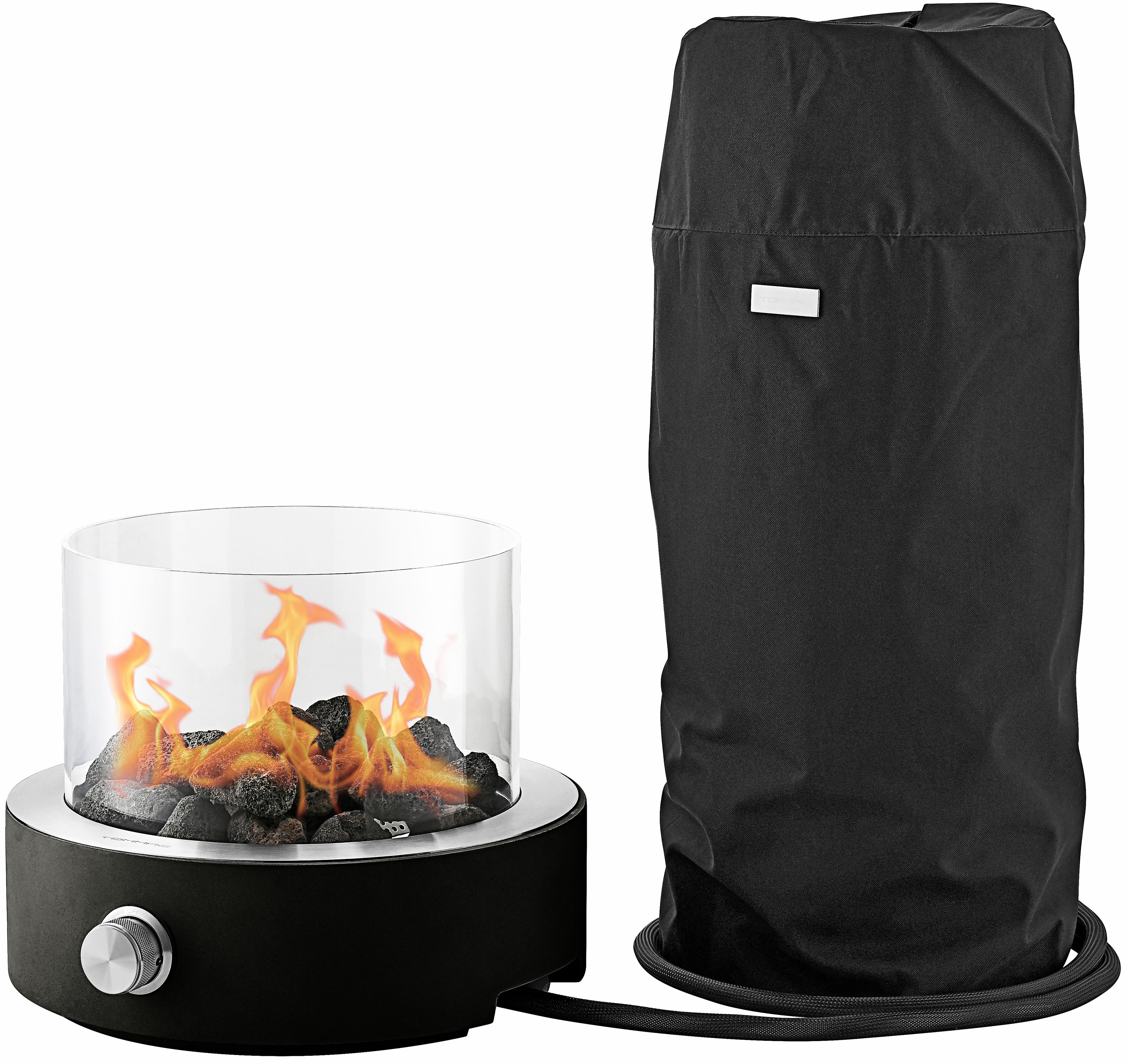 Den gråa eller svarta fiberarmerade betongen möter borstade rostfria detaljer och skapar en vacker kontrast. En vacker eld stiger upp ovanför de svarta lavastenarna bakom ett rent kristallklart glas som ger skydd. Elden startas och regleras med hjälp av ett industriellt designat vred i massivt, rostfritt stål. Funktionen är hållbar och säker, ett inbyggt tändstål säkerställer funktionen i många år framöver och ett inbyggd Terrassvärmaren har gummering undertill för att inte repa bordsytan.