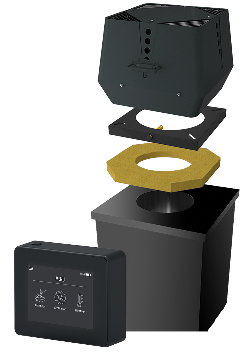 Paketet kommer med Xzense, som är en trådlös styrningsenhet som ansluts till din rökgasfläkt, så att du kan få full kontroll över draget i skorstenen på din vedspis, öppen spis eller eldstad. Med boostfunktionen får du hjälp med upptändningen, och elden kommer snabbt igång. Även vid påfyllning får du hjälp, så att det inte kommer rök ut i rummet när du öppnar ugnsluckan. Till Xzense finns en app för din telefon eller surfplatta, så att du kan styra din rökgasfläkt på samma sätt från telefonen/surfplattan som du kan från Xzense kontrollpanelen. Rökgasfläkten placeras på toppen av skorstenen, där den skapar ett negativt tryck i rökröret och skorstenen för optimalt drag.