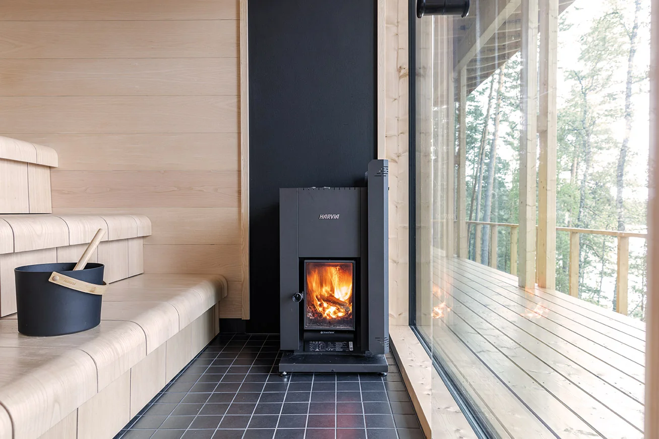 Skyddsväggen till Harvia Linear 22 minskar säkerhetsavståndet till brännbara material – i praktiken får bastuugnen plats på mindre yta utan att kompromissa med säkerheten.