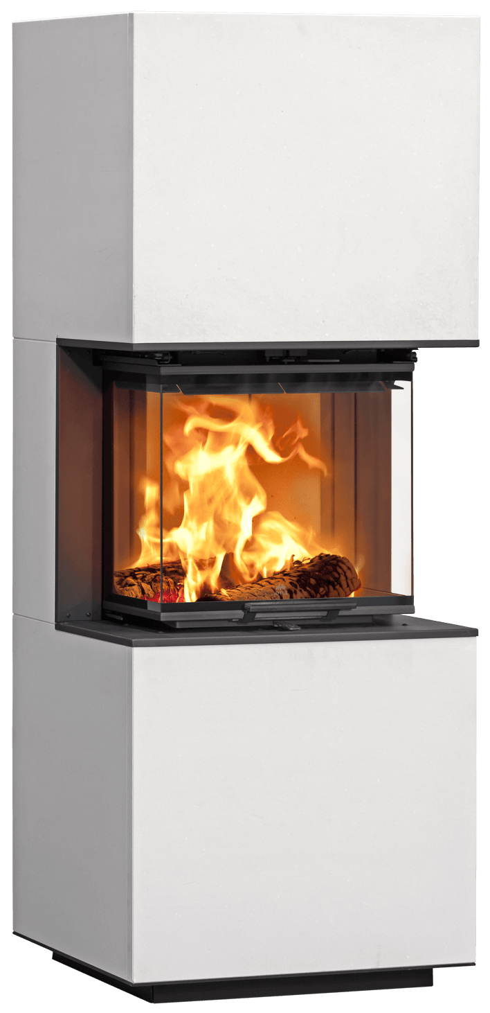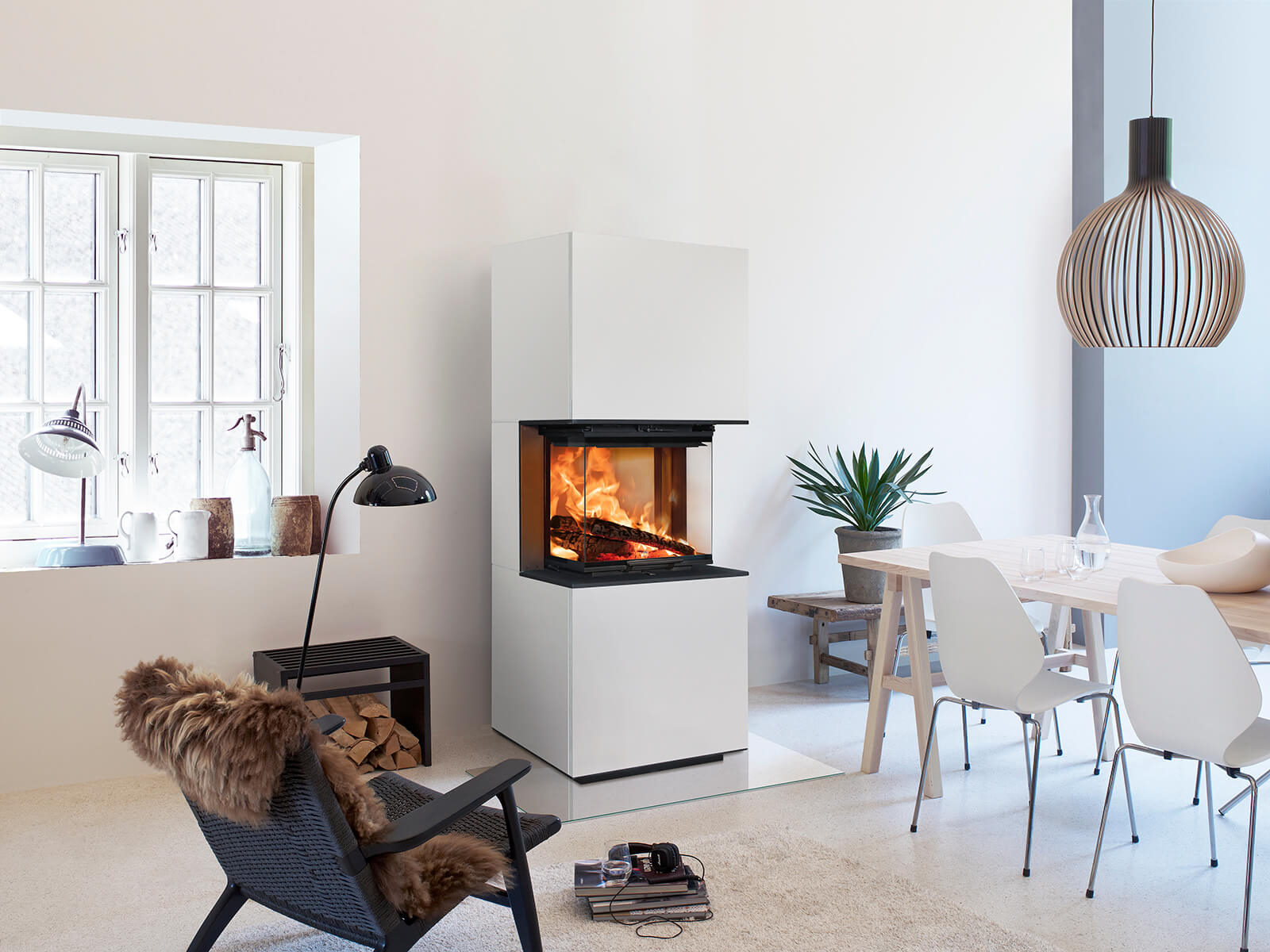 FS 320 från norska Jötul är en murspis med glas på tre sidor som ger en fantastisk insyn till lågorna oavsett var du befinner dig i rummet. Designen är enkel och elegant, och höjden på brännkammaren gör att den passar i olika typer av rum. De sömlösa övergångarna i glaset på insatsen ger en otroligt fin insyn till lågorna.