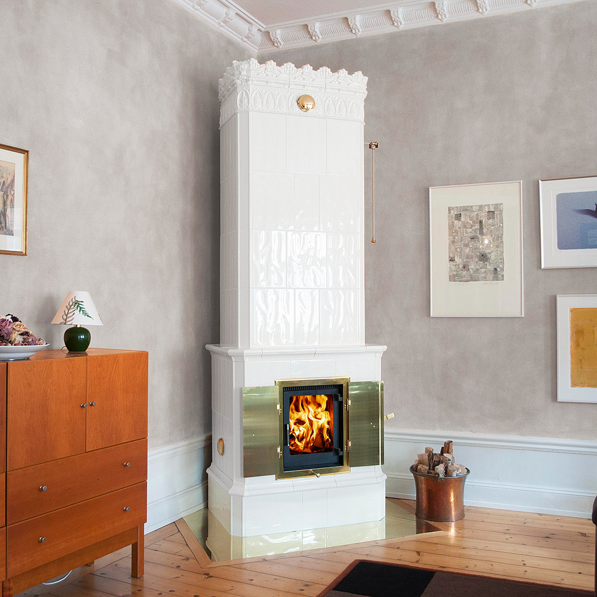 Kungälv är en imponerande kakelugn med sin vackra och ståtliga krona. Kombinationen av den traditionella kakelugnens vackra linjer och utsmyckningar samt den stora glasluckan ger ett exklusivt intryck. Koppla av framför eldens inbjudande sken och njut av den behagliga och långsamma värmespridningen som gör kakelugnen så unik.