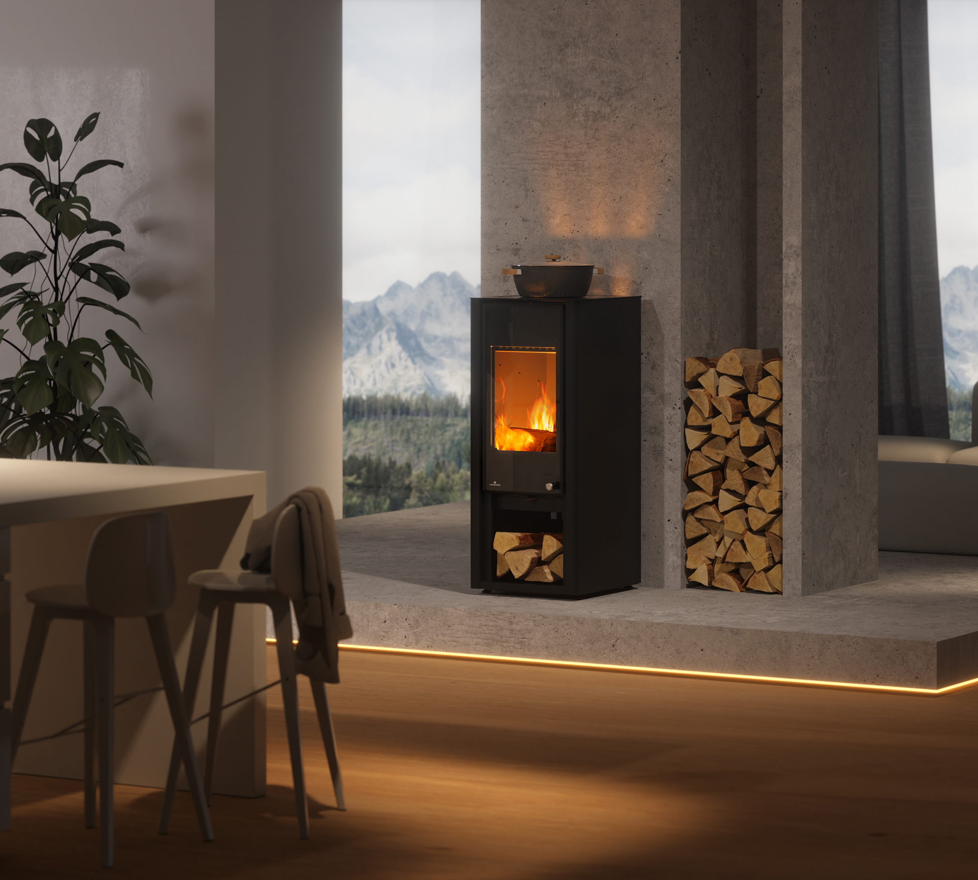Cook Me från Lohberger är en modern kamin med raka och moderna linjer som också går att laga mat på. Hela toppen är en kokplatta som du t.ex. kan ställa en gryta på. Vedfack i sockeln och det finns en träfront som tillval för sockeln. På grund av kokplattan är Cook Me endast för bakansluten skorsten.