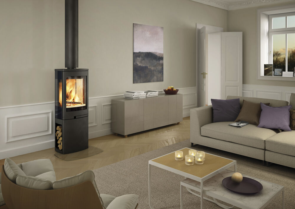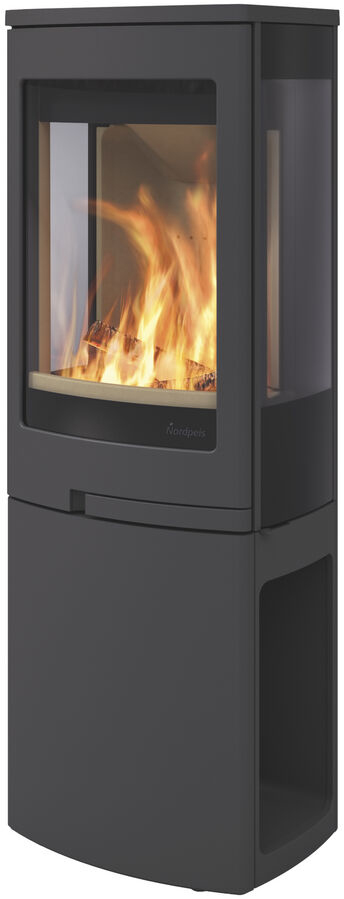 Nordpeis Duo 2 med pelare är en modern vedkamin med stor glaslucka och sidoglas som gör att brasan syns tydligt. Kaminen har ett praktiskt utrymme för vedförvaring på sidan.Vedkaminen kan anslutas till en extern tilluftskanal, vilket är lämpligt i välisolerade bostäder med minimal naturlig ventilation.