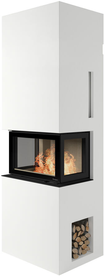 Genève är en murspis som vågar ta plats – perfekt för större rum där den verkligen kan komma till sin rätt. Modellen når nästan ända upp till tak av standardhöjd (2400mm). I kombination med en stilren design och en imponerande insyn till brasan från tre håll är det ingen tvekan om att Genève blir ett smycke i hemmet. Tack vare de stilrena vedfacken under insatsen kan du förvara veden i närheten, utan att resten av inredningen störs.