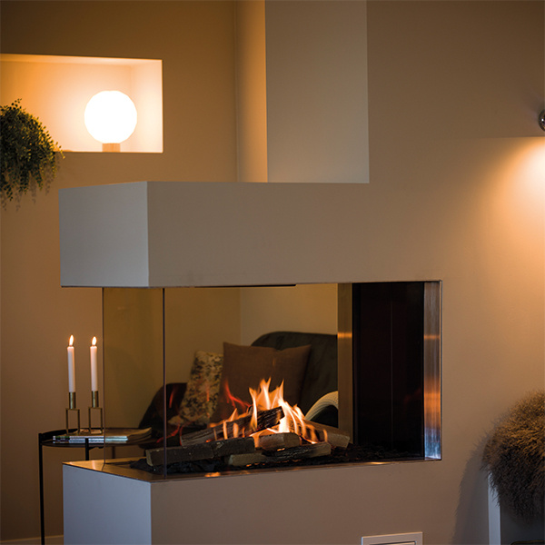 RAIS Visio 70 RD med två frontglas på 65 cm är den minsta av de två rumsavdelarna. Gaskaminen är idealisk att använda som rumsavdelare i stora rum, där du kan njuta av brasan från två olika håll. De tre glassidorna ser till att det finns maximal insyn till brasan – och lågorna kan på så sätt verkligen upplevas till fullo. Gaskaminen kontrolleras med fjärrkontrollen eller telefonen/surfplattan, och värmen kan höjas/sänkas efter behov. Denna modell finns med ram i svart eller rostfritt stål. Kan anslutas till naturgas, stadsgas, gasol eller biogas.
