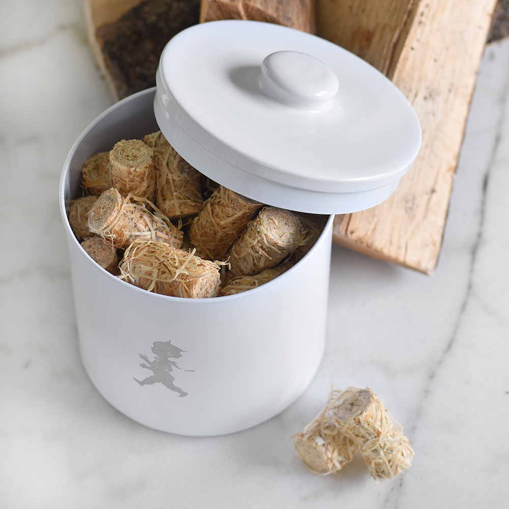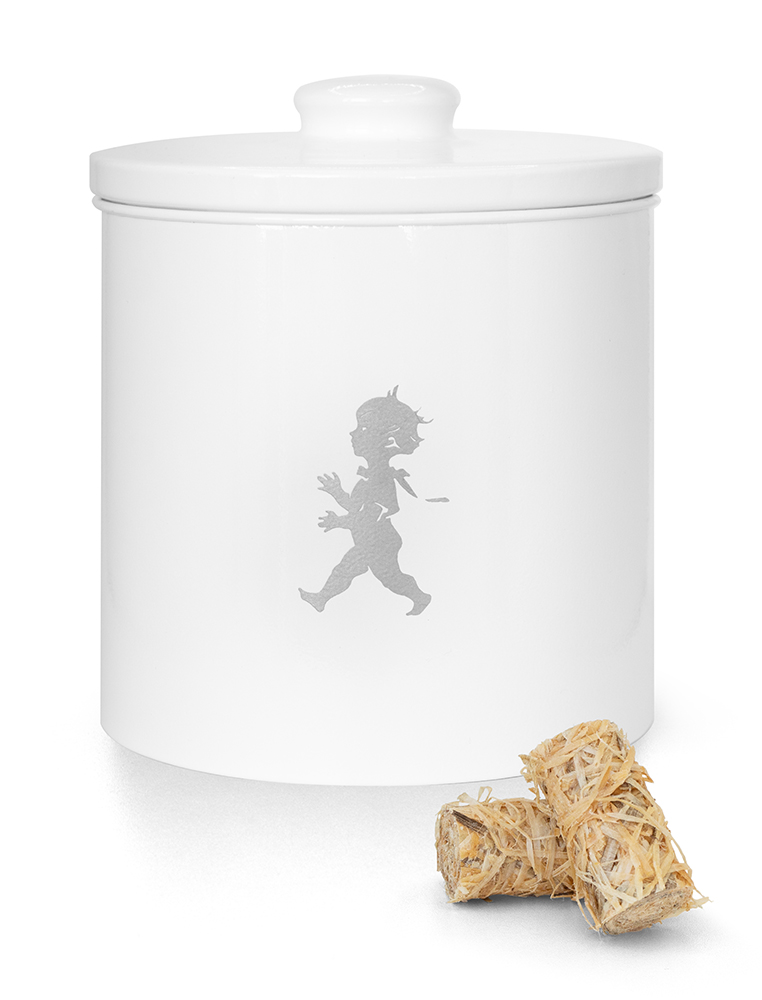 Elegant vit förvaringsburk för braständare – håll värmen med stil med hjälp av Solstickans Design.