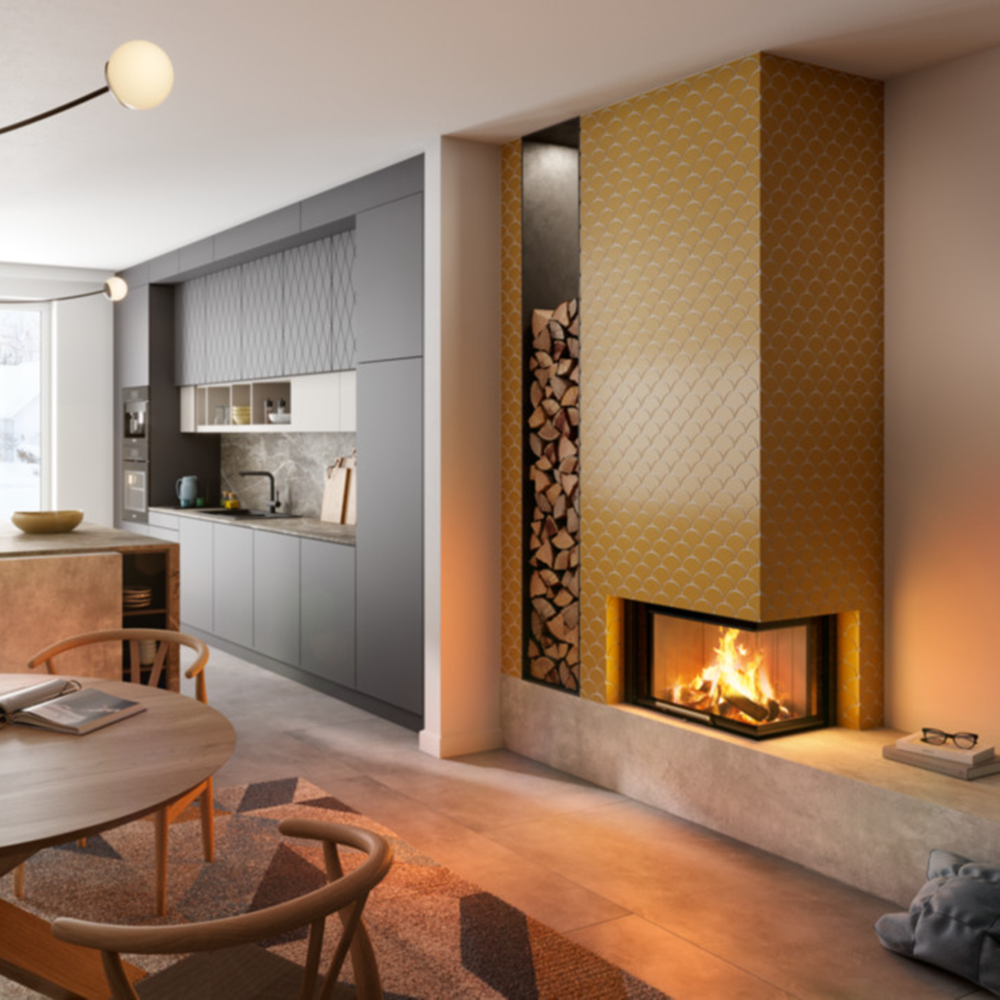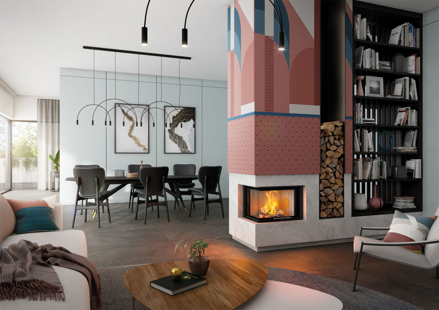 Som tillval finns det svart eldstadsinredning för ännu större kontrast mot lågornas gula sken.