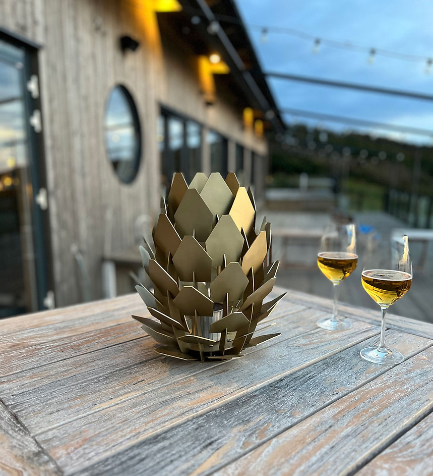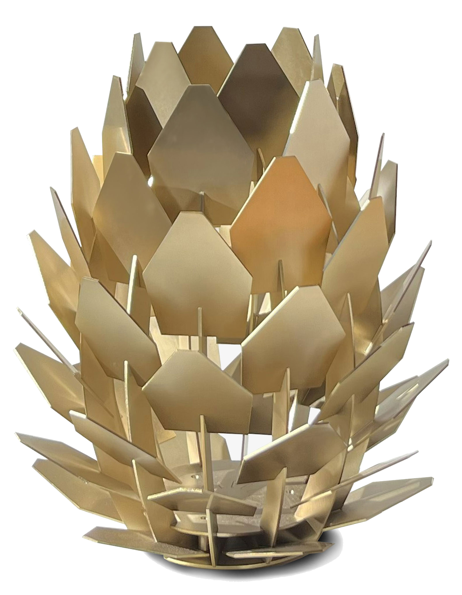 KOTTE Lykta är en bordsmodell i rostfritt stål med en PVD behandlad mässingyta för blockljus där lågans sken flammar upp mellan bladen. Den organiska formen gör den till en eyecatcher för din innemiljö under dagen och ger en häftig effekt under kvällen när skenet från ljusets flamma skapar ett ljusspel på din vägg.
